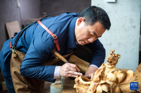 洞口木雕已被正式列入湖南省省级非物质文化遗产名录,木雕产品远销70多个国家和地区。  记者 陈思汗 摄